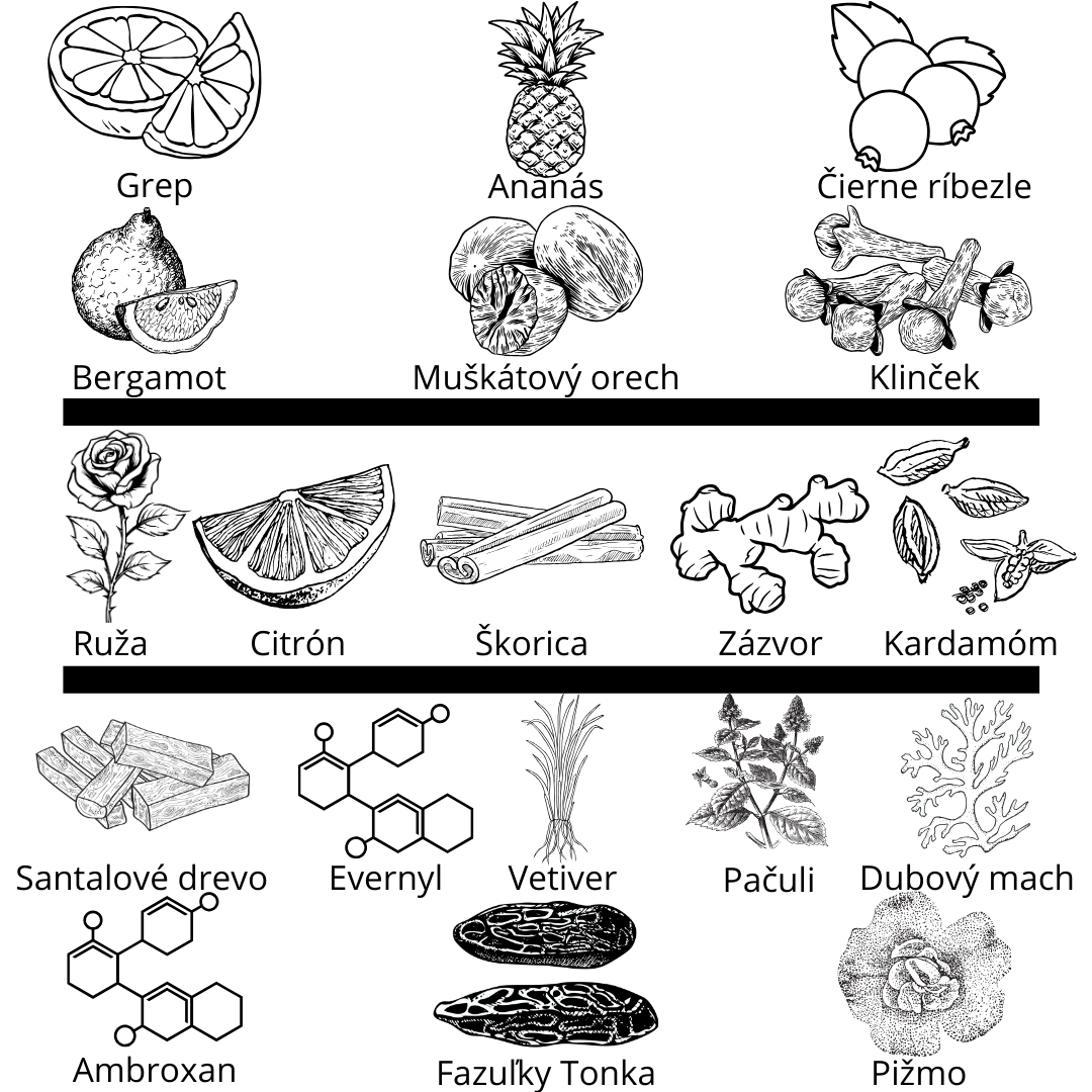 - Srdce: ruža, citrón, škorica, zázvor, kardamóm