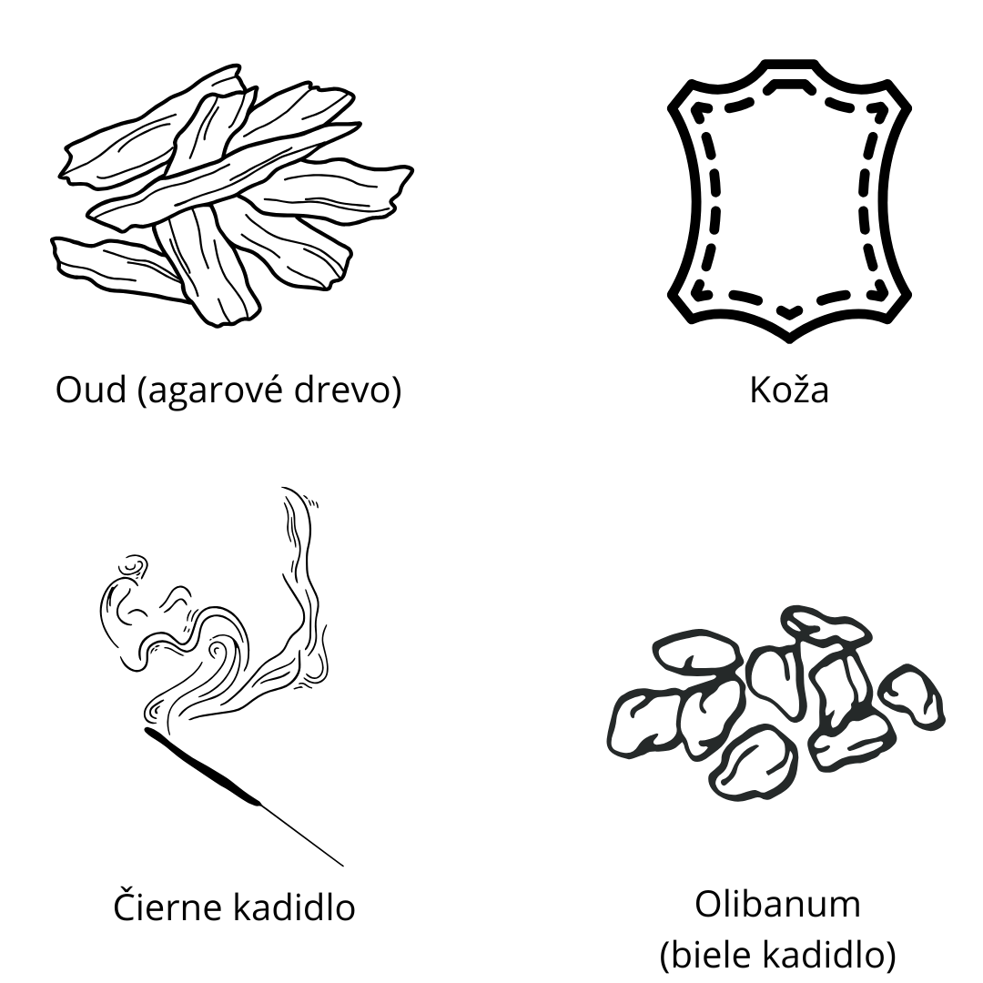 - Tóny: oud (agarové drevo), koža, kadidlo, olibanum (biele kadidlo)